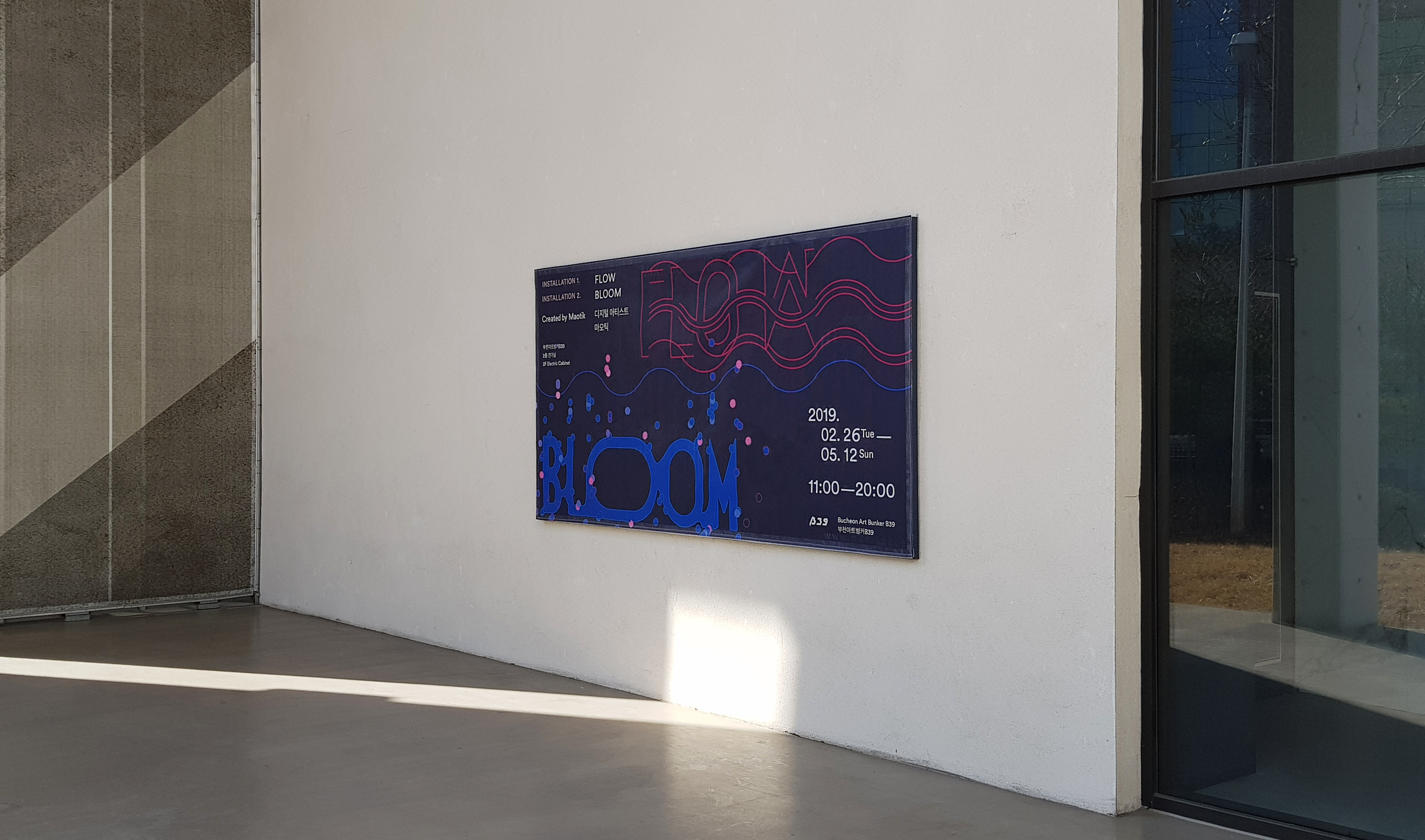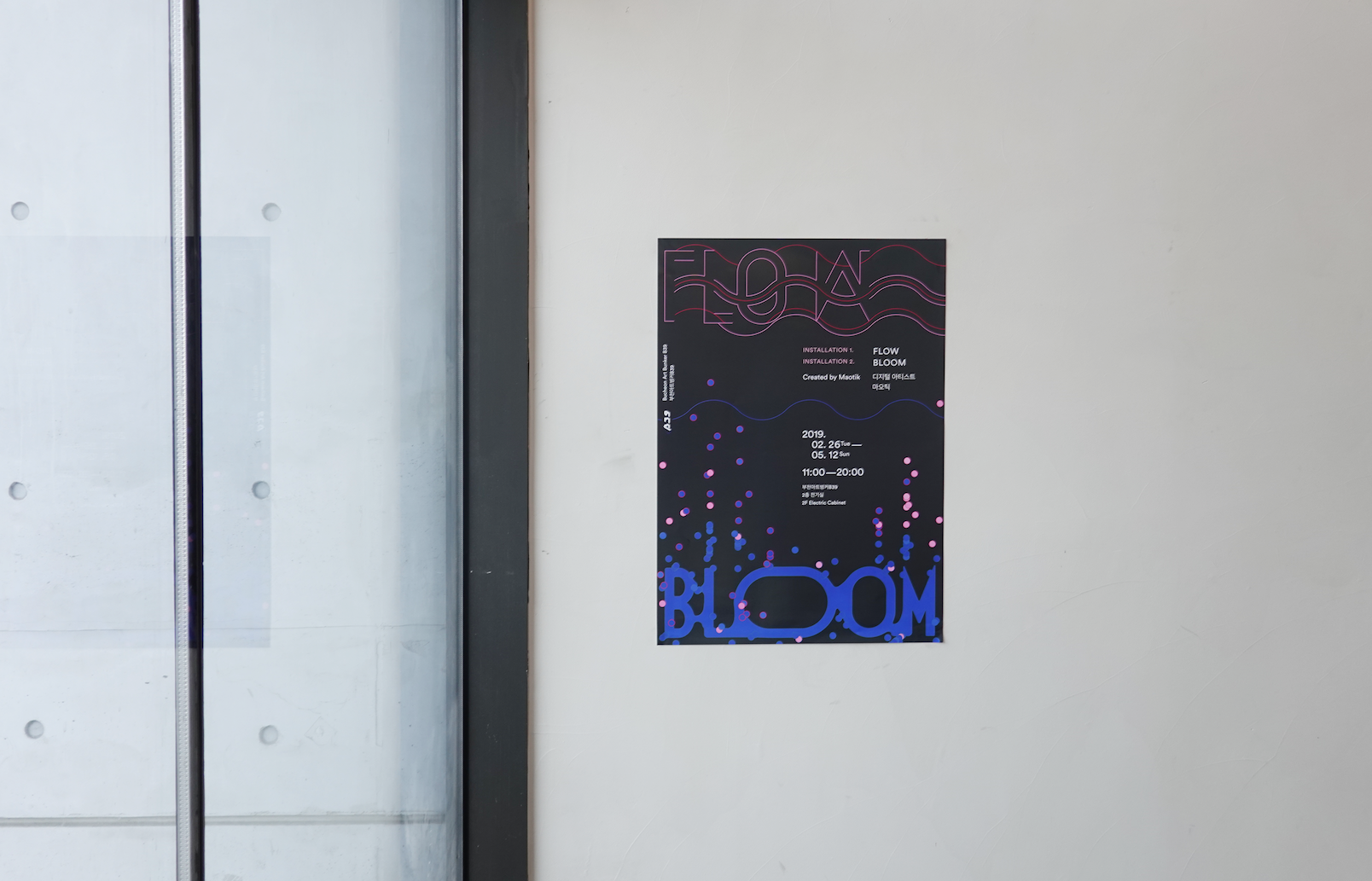 Graphics, poster, and exhibition booklet design for "Flow & Bloom," an exhibition by digital artist Maotic.